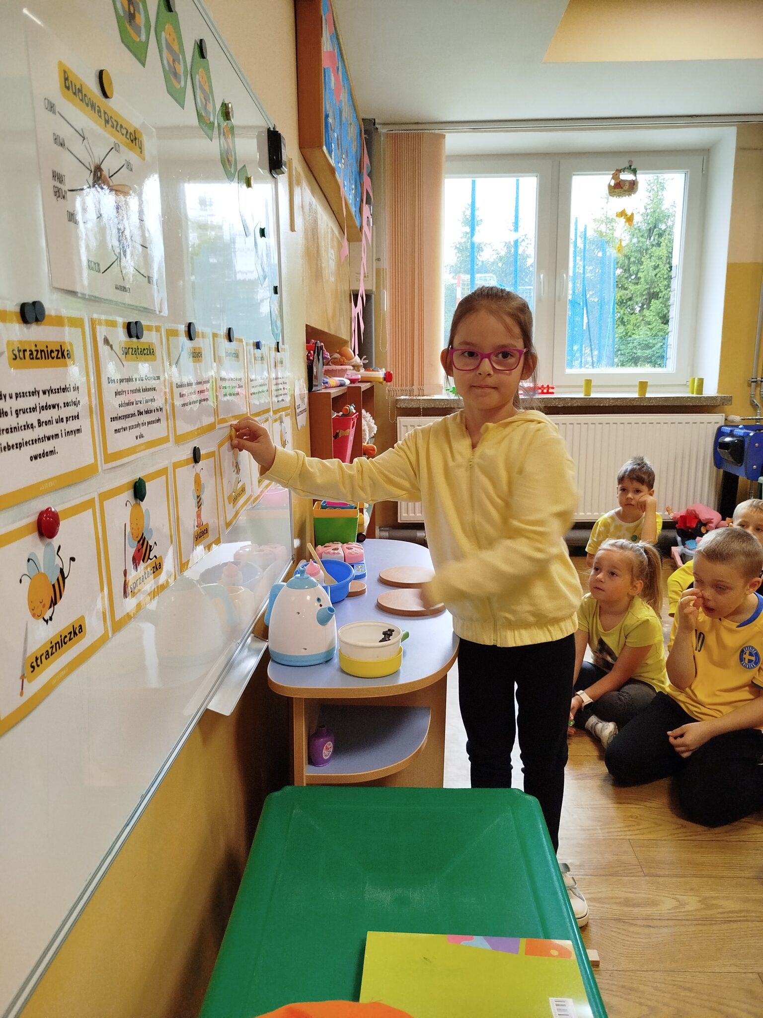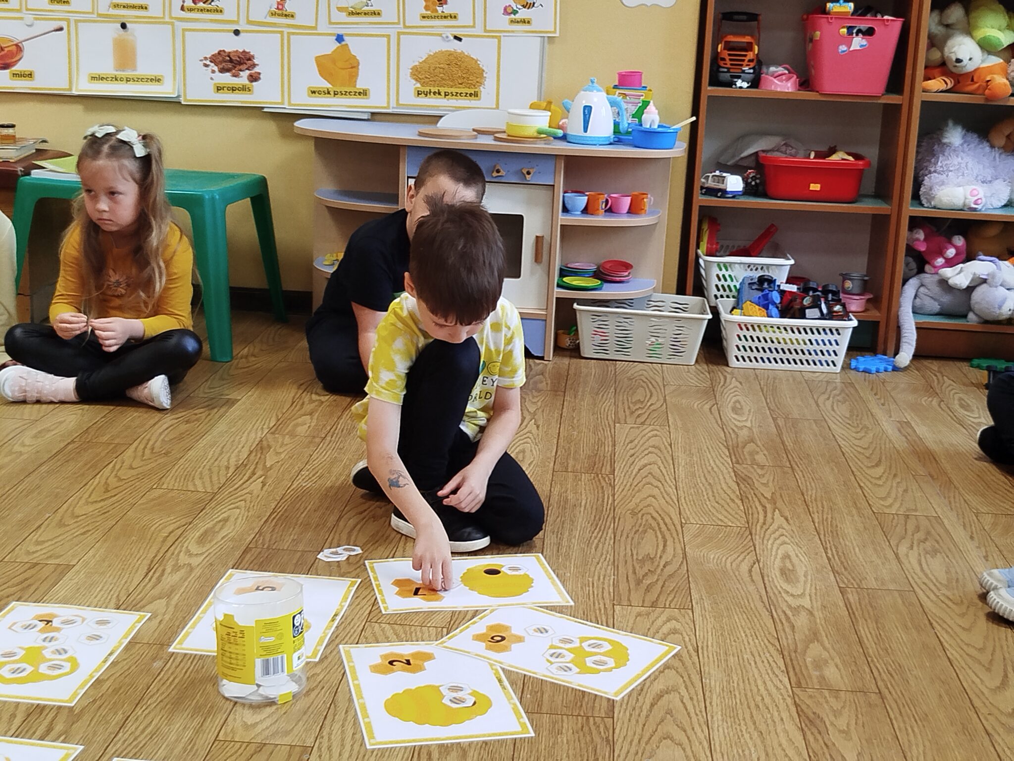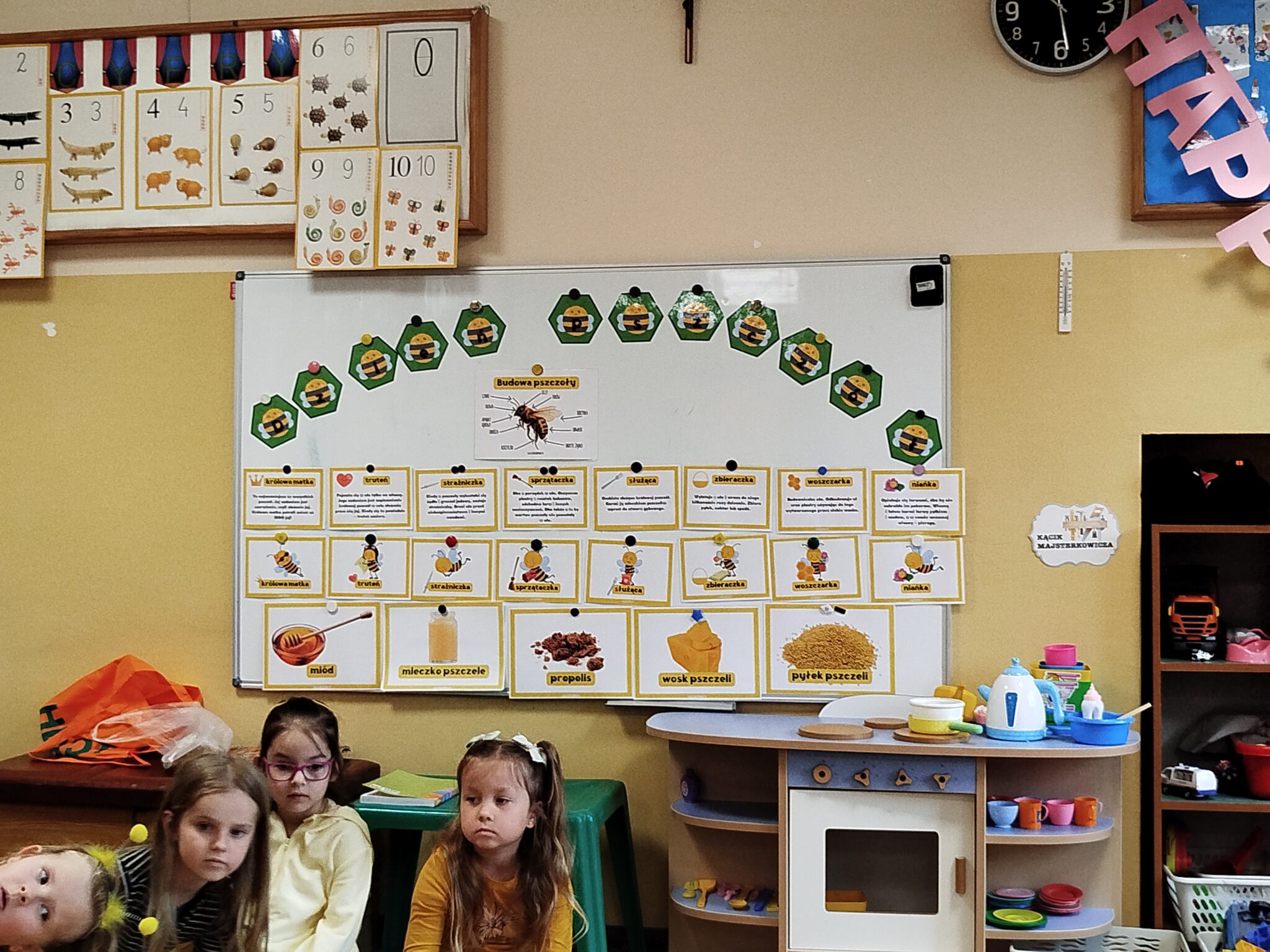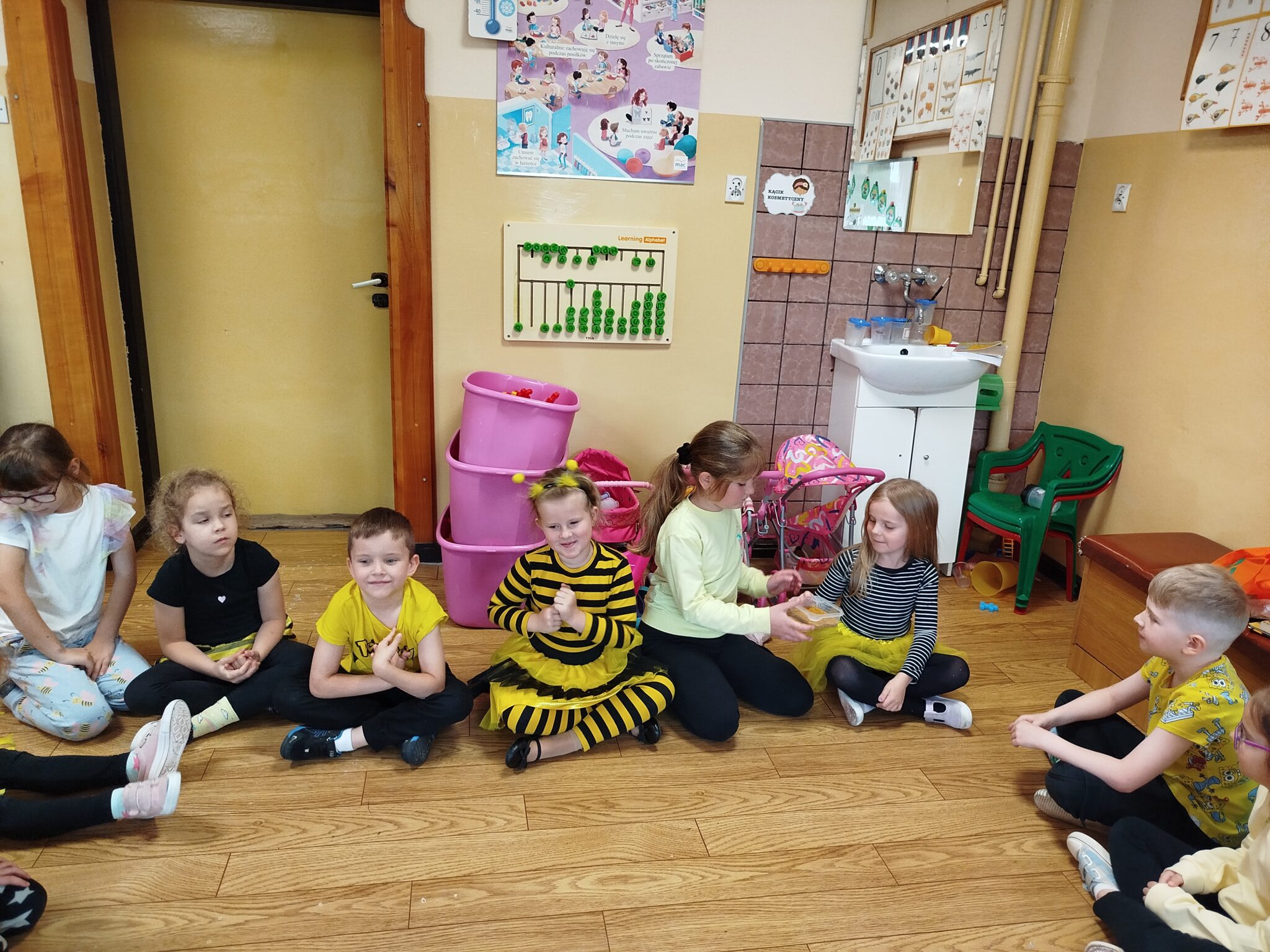 W części plastycznej dzieci wykonały kolorowe pszczółki z papieru kolorowego i rolek po papierach , które ozdobiły naszą salę. Nie zabrakło również zabaw ruchowych – dzieci bawiły się w „pszczółki zbierające nektar” oraz rozwiązywały zagadki tematyczne i matematyczne.
